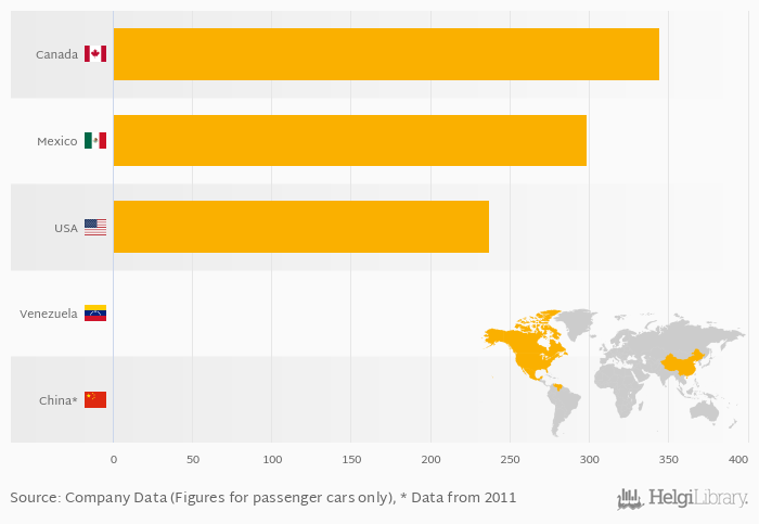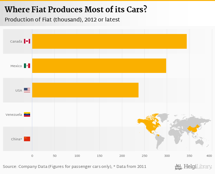 Based on a comparison of 5 countries in 2012, Canada ranked the highest in production of Fiat with 345 '000 followed by Mexico and USA. On the other end of the scale was China with 0.014 '000, Venezuela with 0.952 '000 and USA with 237 '000.