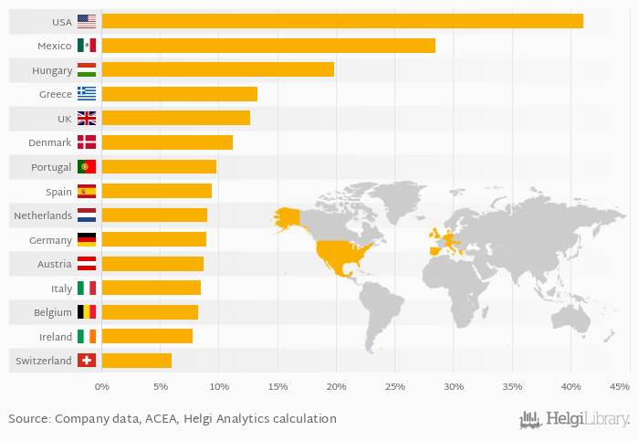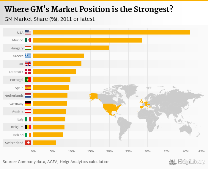 Based on a comparison of 22 countries in 2011, USA ranked the highest in GM market share with 41.1% followed by Mexico and Hungary. On the other end of the scale was Czech Republic with 2.58%, Sweden with 2.95% and Norway with 3.61%.