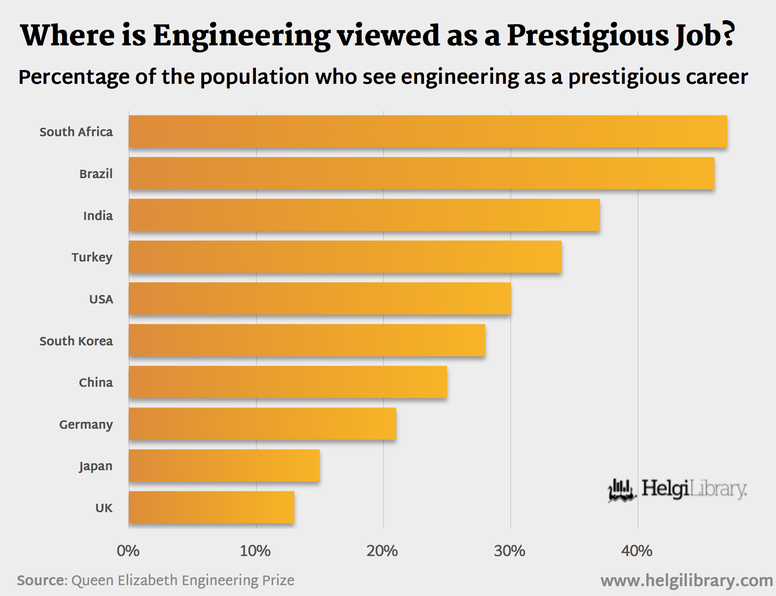 Following South Africa in second place is fellow BRICS economy, Brazil, where 46% of the population see engineering as a prestigious profession. The top 3 is completed by India, with 37%.