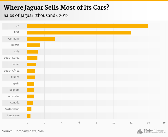 Based on a comparison of 40 countries in 2012, United Kingdom ranked the highest in sales of Jaguar with 14.0 '000 followed by USA and Germany. On the other end of the scale was Croatia with 0.001 '000, Greece with 0.003 '000 and Argentina with 0.007 '000.