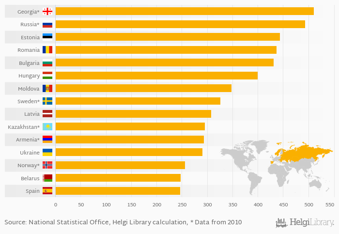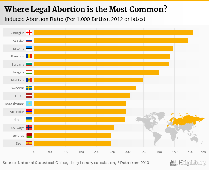 Based on a comparison of 38 countries in 2012, Georgia ranked the highest in induced abortion ratio per 1,000 births with 511 followed by Russia and Estonia. On the other end of the scale was Poland with 1.94, Malaysia with 10.2 and Tajikistan with 42.5.