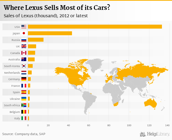 Based on a comparison of 39 countries in 2012, USA ranked the highest in sales of Lexus with 133 '000 followed by Japan and Russia. On the other end of the scale was Argentina with 0.001 '000, Croatia with 0.016 '000 and Brazil with 0.020 '000.