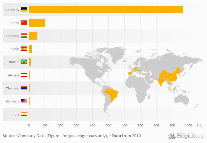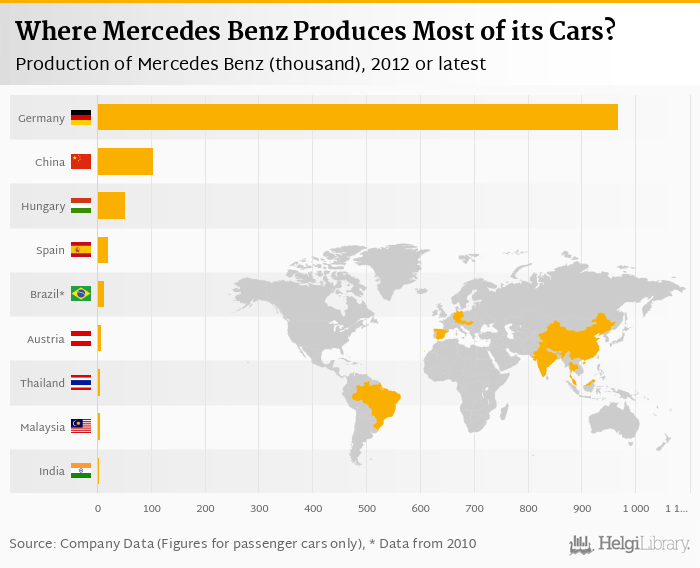 Based on a comparison of 9 countries in 2012, Germany ranked the highest in production of Mercedes-Benz with 968 '000 followed by China and Hungary. On the other end of the scale was India with 3.88 '000, Malaysia with 5.16 '000 and Thailand with 5.22 '000.
