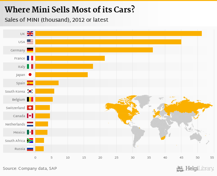 Based on a comparison of 43 countries in 2012, United Kingdom ranked the highest in sales of Mini with 51.3 '000 followed by USA and Germany. On the other end of the scale was Venezuela with 0.002 '000, Thailand with 0.039 '000 and Croatia with 0.067 '000.