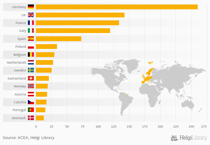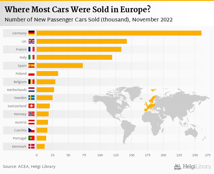 In November, most vehicles (261 thousand) were sold in Germany (up 31.4% yoy), followed by the United Kingdom (143 thousand, up 23.5%), France with 134 thousand cars (up 9.81%), 120 thousand new vehicles were registered in Italy (up 14.7%) and 73.2 thousand in Spain (up 10.3%). The five largest countries accounted for 64.8% of total new vehicles registered in November 2022.