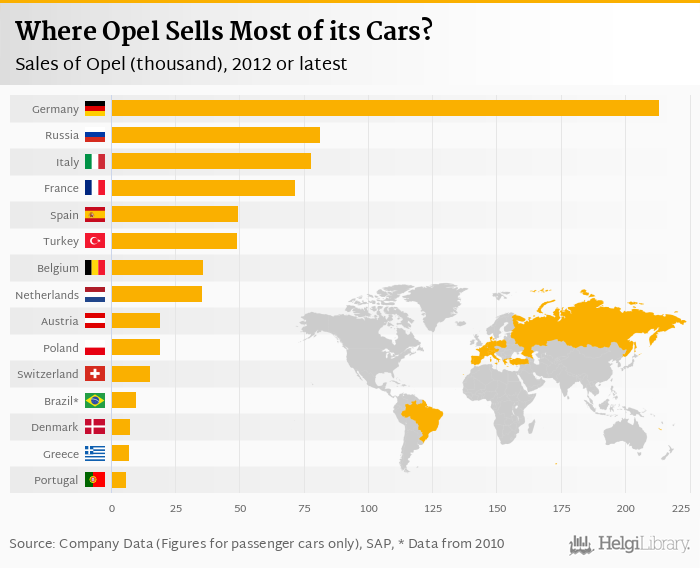 Based on a comparison of 32 countries in 2012, Germany ranked the highest in sales of Opel with 213 '000 followed by Russia and Italy. On the other end of the scale was Argentina with 0.001 '000, Japan with 0.001 '000 and Singapore with 0.099 '000.