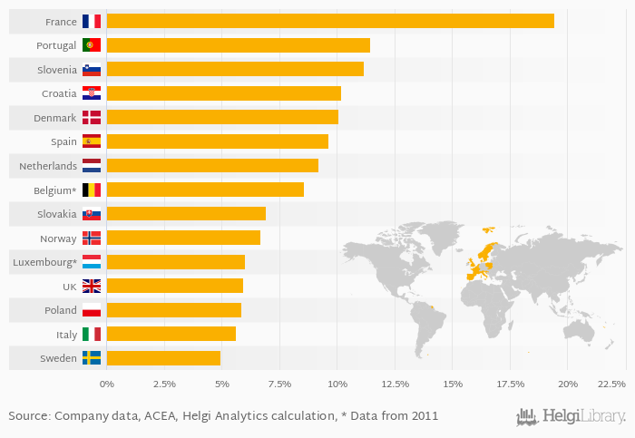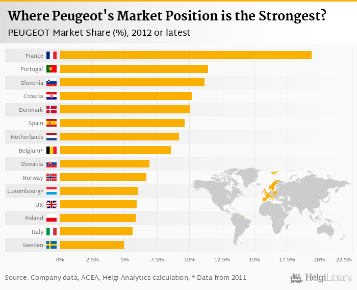 Based on a comparison of 29 countries in 2017, France ranked the highest in Peugeot market share with 19.4% followed by Portugal and Slovenia. On the other end of the scale was Mexico with 0.979%, Malaysia with 0.999% and Iceland with 1.27%.