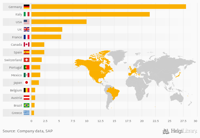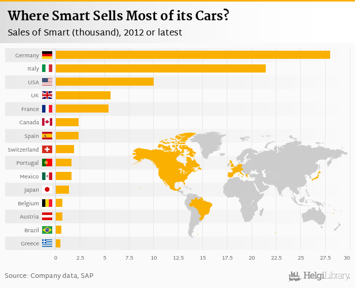 The top ranked country, Germany, accounted for 32.4 % of sales of Smart in the world. The top 3 countries hold a 68.7 % share while the ten largest countries some 92.9 % in 2012.