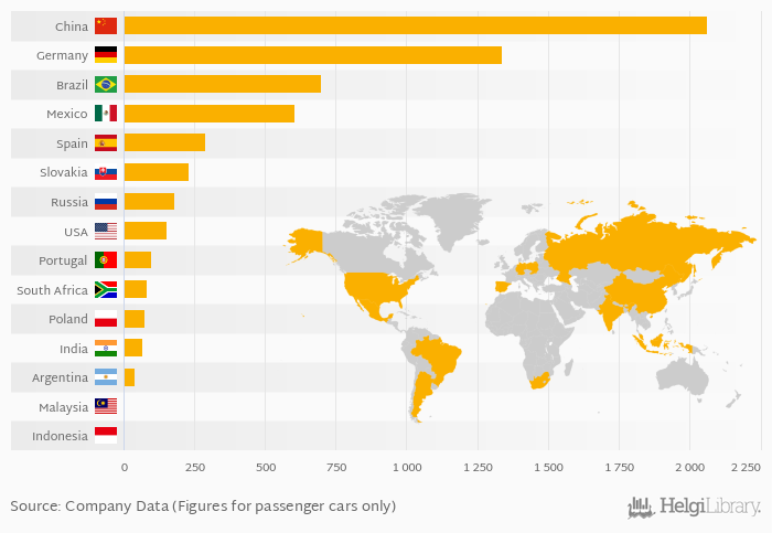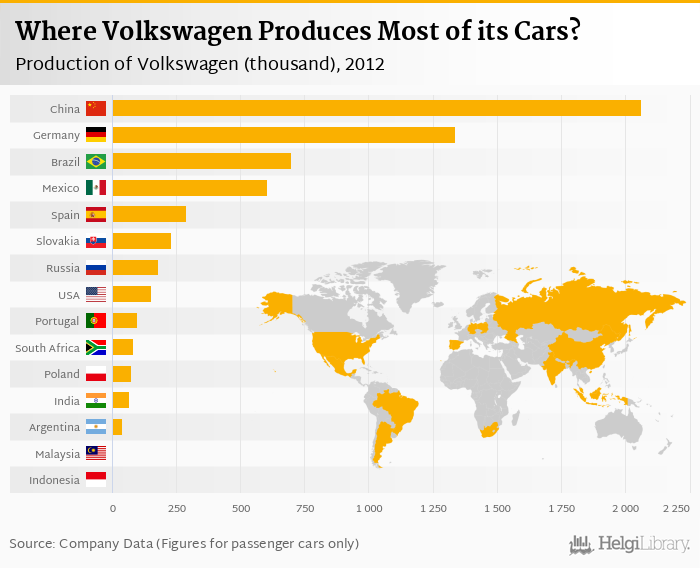 Based on a comparison of 15 countries in 2012, China ranked the highest in production of Volkswagen with 2,061 '000 followed by Germany and Brazil. On the other end of the scale was Indonesia with 1.60 '000, Malaysia with 1.66 '000 and Argentina with 37.6 '000.