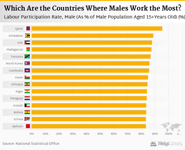 Based on a comparison of 173 countries in 2021, Qatar ranked the highest in Labour Participation Rate, Male (As % of Male Population Aged 15+Years Old) with 95.5% followed by Zimbabwe and United Arab Emirates. On the other end of the scale was Moldova with 43.9%, Djibouti with 44.1% and Somalia with 47.0%.