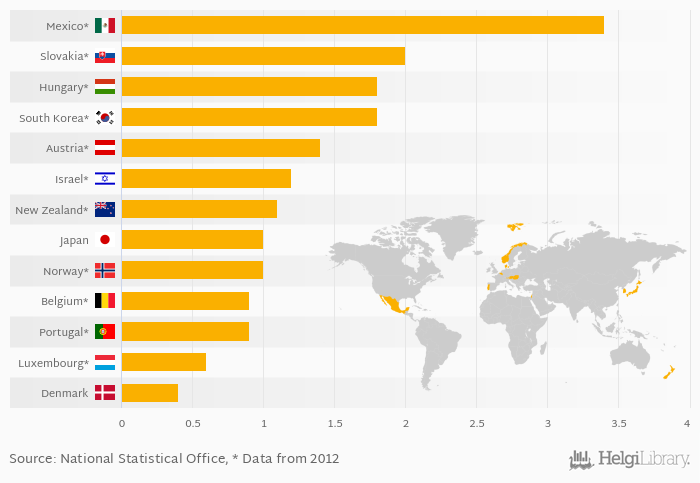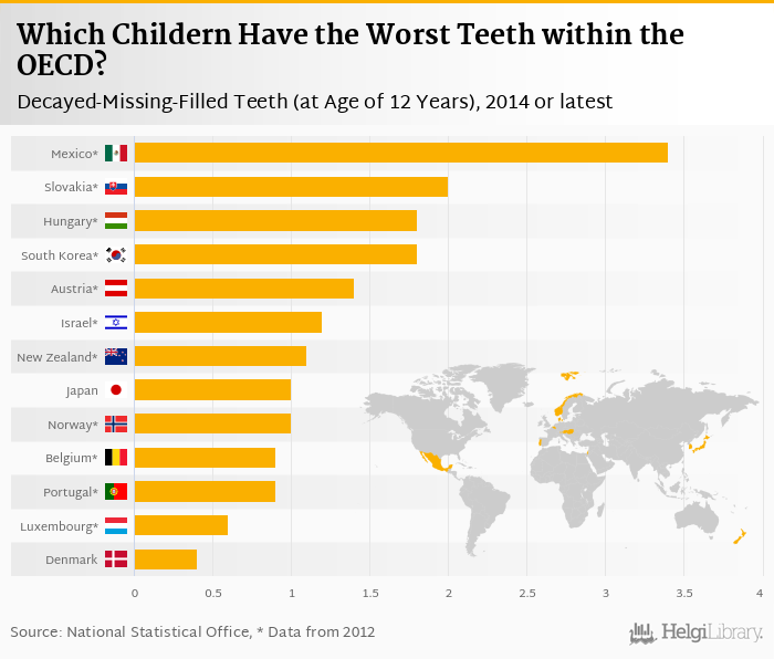 Based on a comparison of 13 countries in 2014, Mexico ranked the highest in decayed-missing-filled teeth of children aged 12 years with 3.40 followed by Slovakia and Hungary. On the other end of the scale was Denmark with 0.400, Luxembourg with 0.600 and Portugal with 0.900.