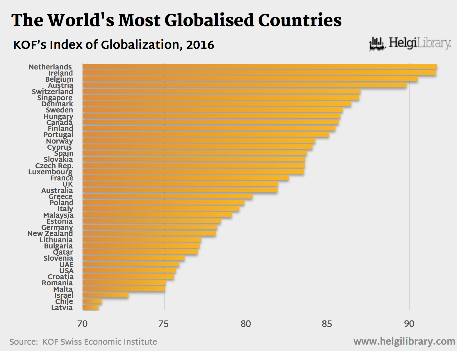 So how exactly were these rankings calculated? KOF’s Index of Globalization ranks countries based on three key dimensions: economic, social and political. The index is calculated using data referring to actual economic flows, economic restrictions, data on information flows, data on personal contact and data on cultural proximity.