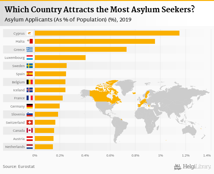 Based on a comparison of 43 countries in 2019, Cyprus ranked the highest in asylum applicants as a percentage of total population with 1.15% followed by Malta and Greece. On the other end of the scale was Chile with 0.004%, Slovakia with 0.004% and Hungary with 0.005%.