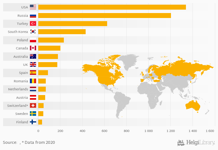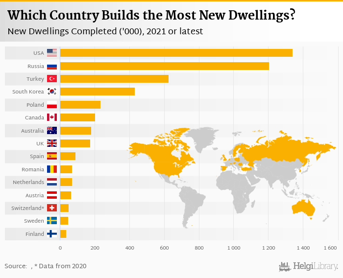 Based on a comparison of 30 countries in 2021, USA ranked the highest in new dwellings completed with 1,341 '000 followed by Russia and Turkey. On the other end of the scale was Latvia with 2.85 '000, Iceland with 3.82 '000 and Bulgaria with 3.90 '000.
