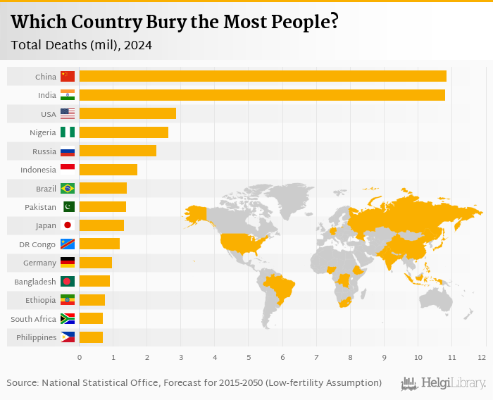 Based on a comparison of 174 countries in 2024, China ranked the highest in deaths with 10.9 mil followed by India and USA. On the other end of the scale was Seychelles with < 0.001 mil, Maldives with 0.001 mil and Brunei with 0.002 mil.