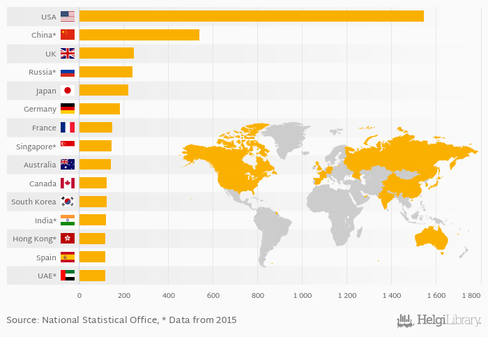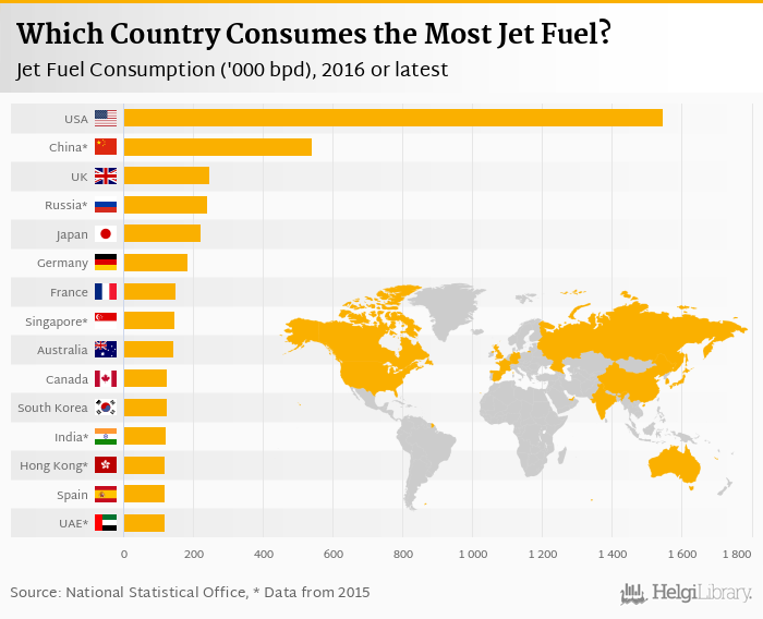 Based on a comparison of 173 countries in 2016, USA ranked the highest in jet fuel consumption with 1,548 '000 bpd followed by China and United Kingdom. On the other end of the scale was Swaziland with 0.022 '000 bpd, Eritrea with 0.022 '000 bpd and Kosovo with 0.043 '000 bpd.