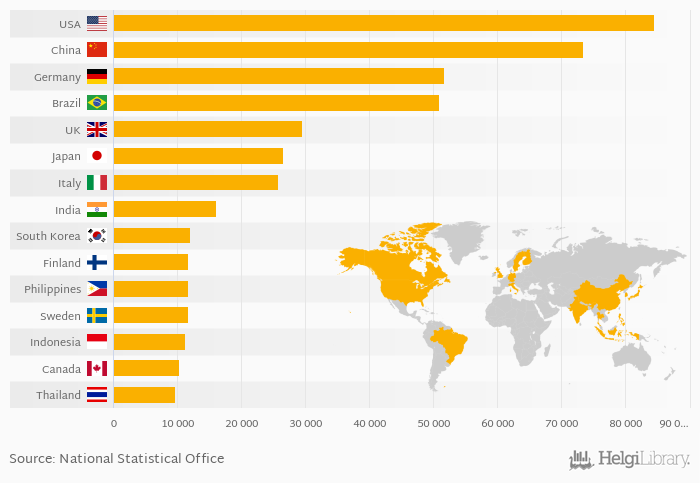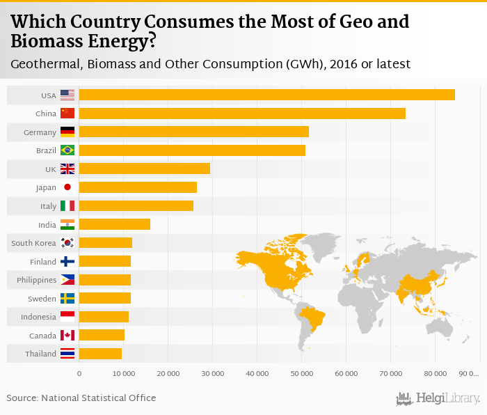 Based on a comparison of 57 countries in 2016, USA ranked the highest in geothermal, biomass and other consumption with 84,607 GWh followed by China and Germany. On the other end of the scale was Kazakhstan with 1.86 GWh, Bangladesh with 2.11 GWh and Iran with 47.1 GWh.