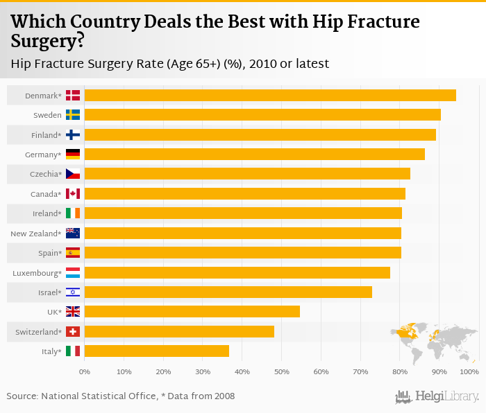 Based on a comparison of 14 countries in 2010, Denmark ranked the highest in hip fracture surgery rate for patients 65 years and older with 94.3% followed by Sweden and Finland. On the other end of the scale was Italy with 36.8%, Switzerland with 48.3% and United Kingdom with 54.8%.