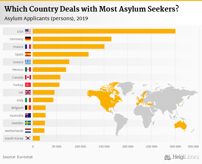 Based on a comparison of 44 countries in 2019, USA ranked the highest in asylum applicants with 301,070 persons followed by Germany and France. On the other end of the scale was Liechtenstein with 50.0 persons, Estonia with 105 persons and Latvia with 195 persons.