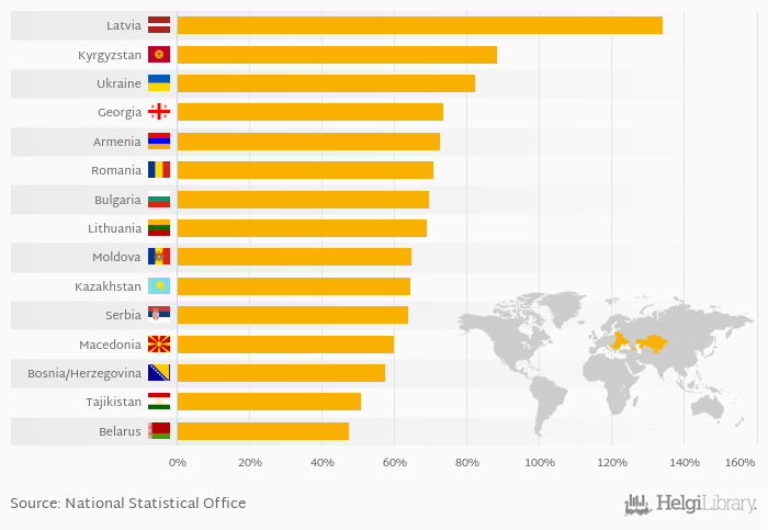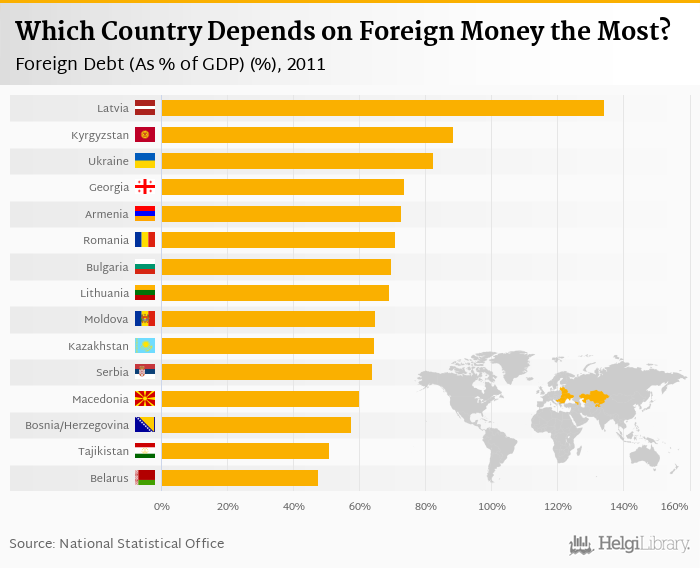 Based on a comparison of 46 countries in 2011, Latvia ranked the highest in foreign debt as a share of GDP with 134% followed by Kyrgyzstan and Ukraine. On the other end of the scale was Turkmenistan with 1.52%, Algeria with 3.03% and Nigeria with 3.17%.