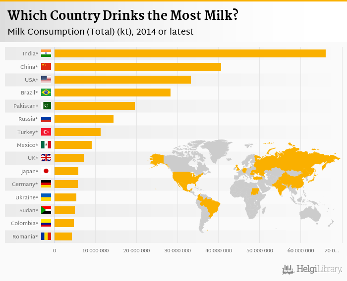 Based on a comparison of 158 countries in 2014, India ranked the highest in milk consumption with 66,123,467 kt followed by China and USA. On the other end of the scale was Macao with 39.9 kt, Dem. People's Republic of Korea with 93.0 kt and Hong Kong with 429 kt.