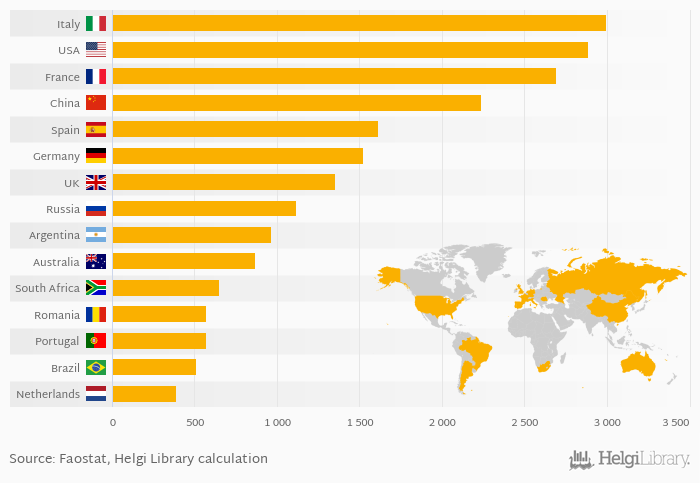 The top ranked country, Italy, accounted for 11.4 % of wine consumption in the world. The top 3 countries hold a 32.6 % share while the ten largest countries some 69.4 % in 2021.