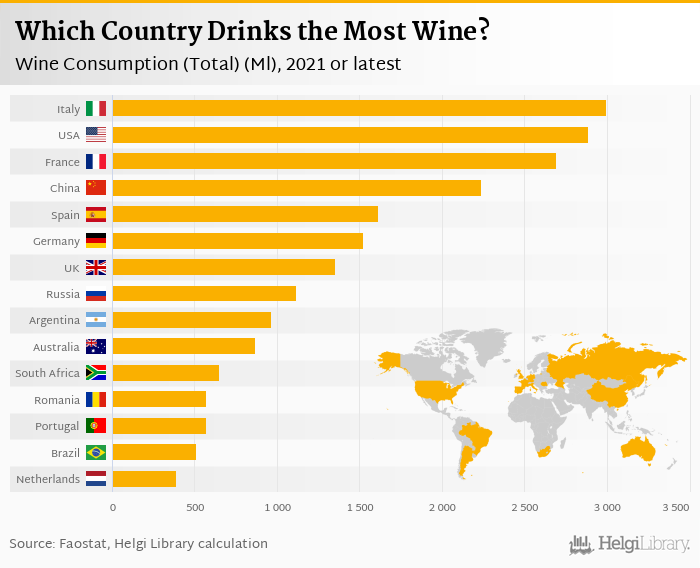 Total wine consumption reached 26,297 Ml in 2021 in the World according to Faostat. This is 1.89 % less than in the previous year and -6.06 % less than 10 years ago.