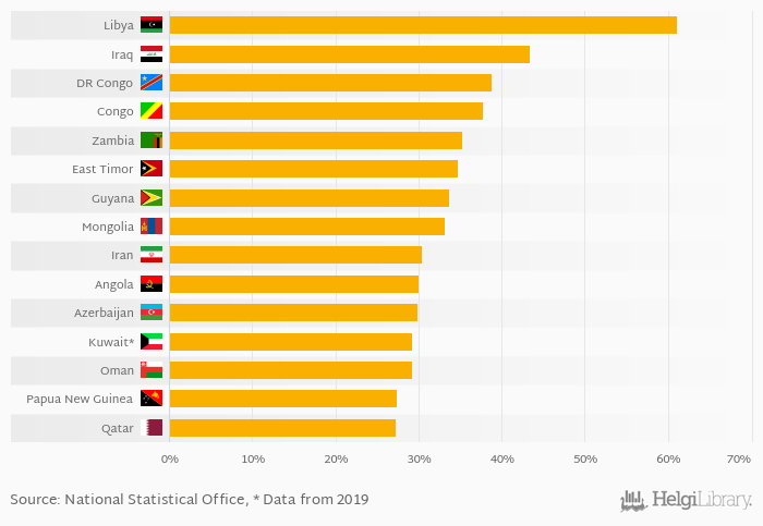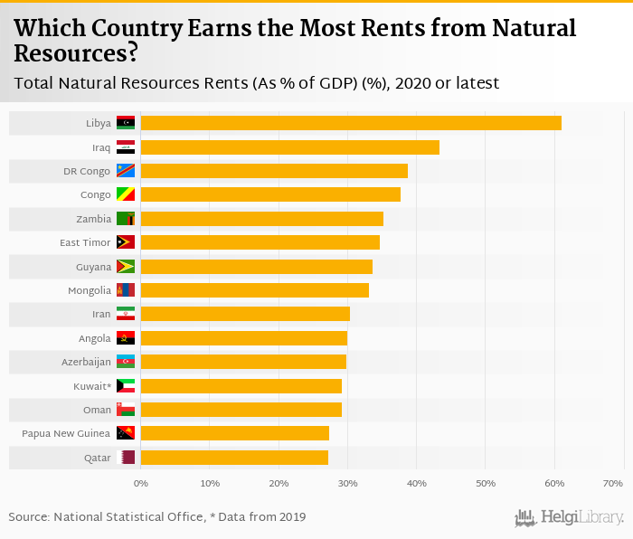 Based on a comparison of 169 countries in 2021, Libya ranked the highest in natural resources rents as a percentage of GDP with 61.0% followed by Iraq and Dem. Republic of the Congo. On the other end of the scale was Iceland with < 0.001%, Singapore with < 0.001% and Macao with < 0.001%.