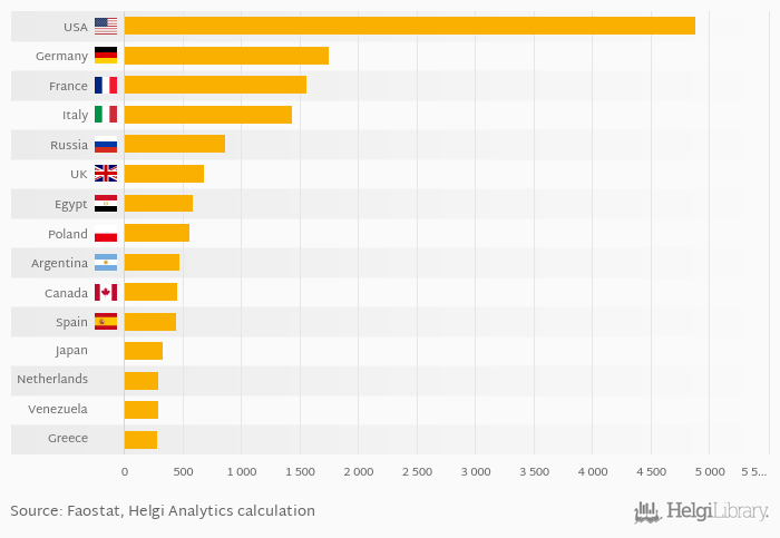 The top ranked country, USA, accounted for 23.6 % of cheese consumption in the world. The top 3 countries hold a 39.6 % share while the ten largest countries some 64.1 % in 2013.