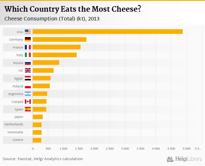 Based on a comparison of 133 countries in 2013, USA ranked the highest in cheese consumption with 4,877 kt followed by Germany and France. On the other end of the scale was East Timor with 0.110 kt, Gambia with 0.184 kt and Djibouti with 0.348 kt.