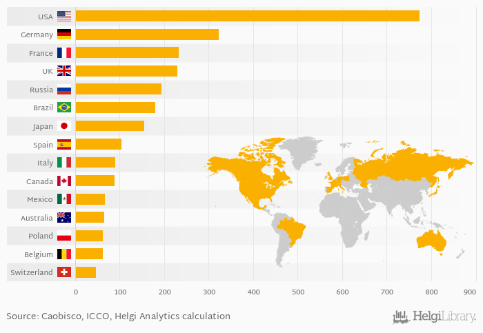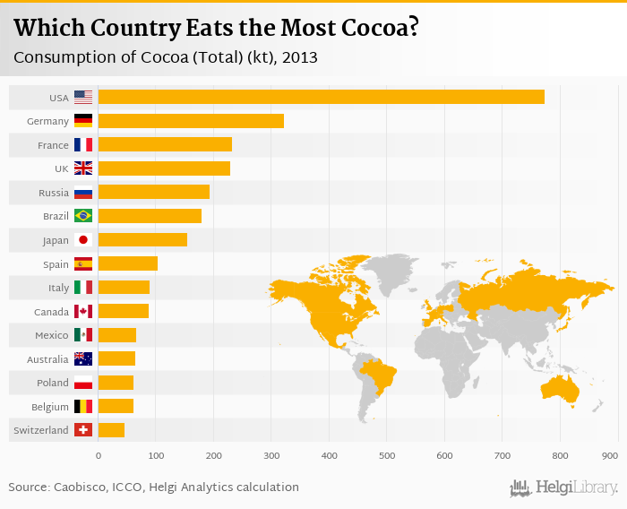 Based on a comparison of 45 countries in 2013, USA ranked the highest in consumption of cocoa with 775 kt followed by Germany and France. On the other end of the scale was Venezuela with 13.0 kt, Ghana with 13.9 kt and Finland with 15.5 kt.