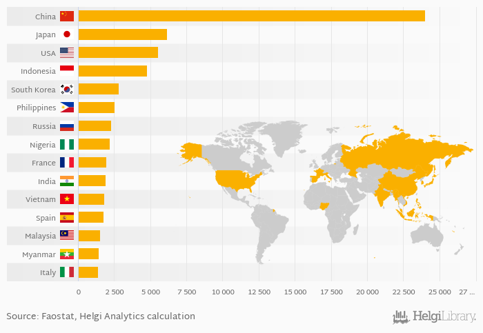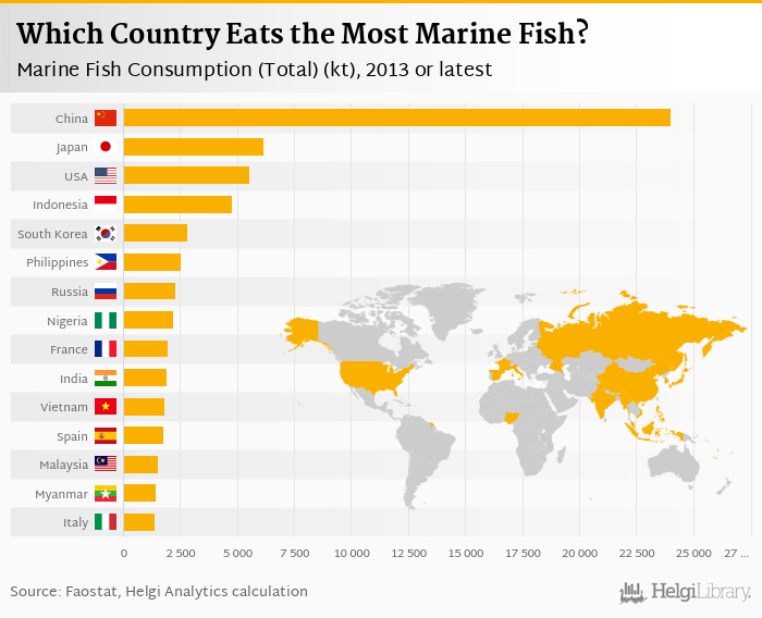Based on a comparison of 157 countries in 2013, China ranked the highest in marine fish consumption with 24,002 kt followed by Japan and USA. On the other end of the scale was Ethiopia with -0.937 kt, Mongolia with 0.770 kt and Lesotho with 0.867 kt.