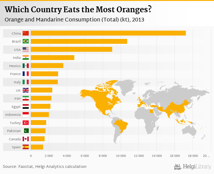 Based on a comparison of 150 countries in 2013, China ranked the highest in orange and mandarine consumption with 17,233 kt followed by Brazil and USA. On the other end of the scale was Tajikistan with 1.63 kt, East Timor with 1.81 kt and Gambia with 2.03 kt.