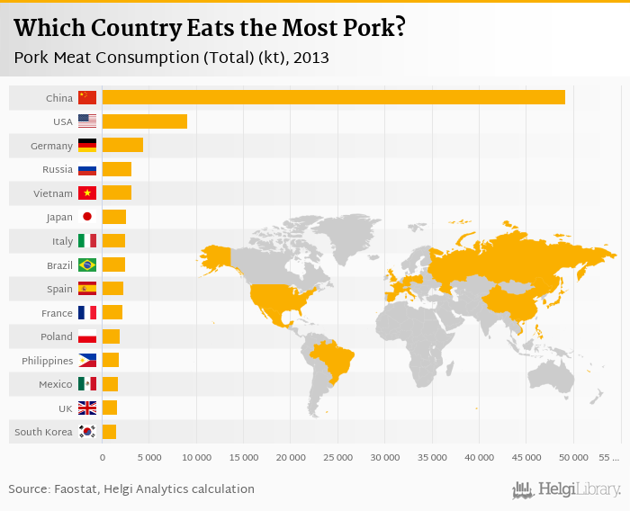 Based on a comparison of 139 countries in 2013, China ranked the highest in pork meat consumption with 49,218 kt followed by USA and Germany. On the other end of the scale was Oman with 0.362 kt, Djibouti with 0.434 kt and Maldives with 0.446 kt.