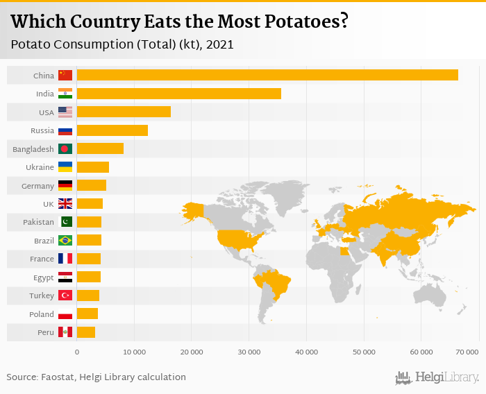 Based on a comparison of 165 countries in 2021, China ranked the highest in potato consumption with 66,437 kt followed by India and USA. On the other end of the scale was South Sudan with 1.00 kt, Central African Republic with 1.00 kt and Guinea Bissau with 2.00 kt.