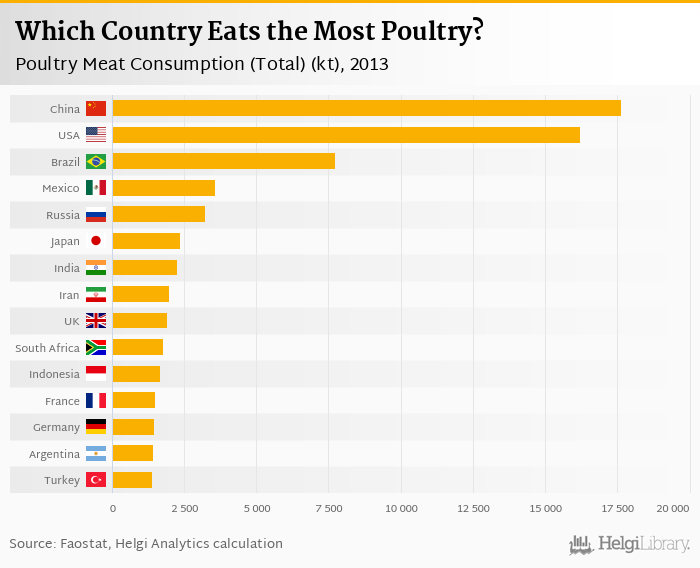 Based on a comparison of 157 countries in 2013, China ranked the highest in poultry meat consumption with 17,647 kt followed by USA and Brazil. On the other end of the scale was Djibouti with 1.48 kt, Rwanda with 2.35 kt and Guinea Bissau with 3.39 kt.