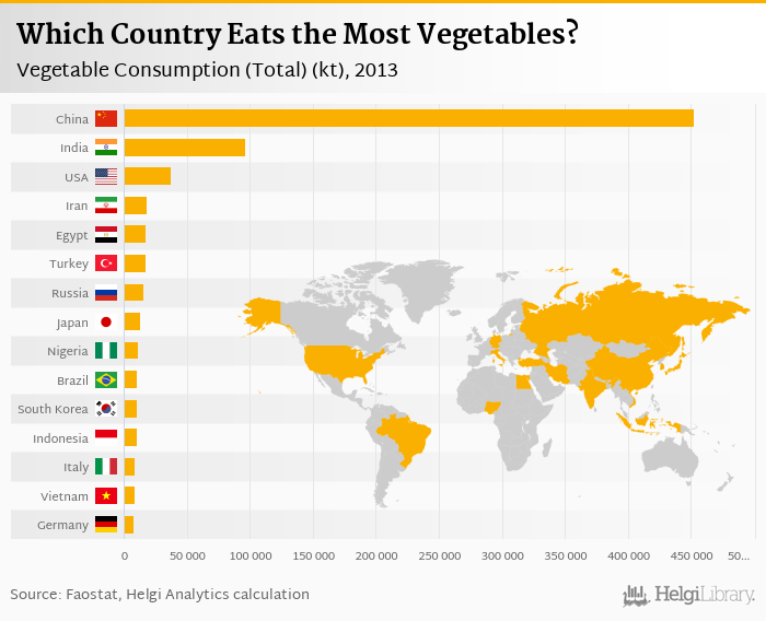 Based on a comparison of 158 countries in 2013, China ranked the highest in vegetable consumption with 452,612 kt followed by India and USA. On the other end of the scale was Belize with 15.6 kt, Swaziland with 21.6 kt and Iceland with 23.5 kt.