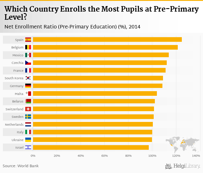Based on a comparison of 74 countries in 2014, Spain ranked the highest in net enrollment ratio in pre-primary education with 125% followed by Belgium and Mexico. On the other end of the scale was Tajikistan with 8.99%, Bosnia and Herzegovina with 14.0% and Nigeria with 16.0%.
