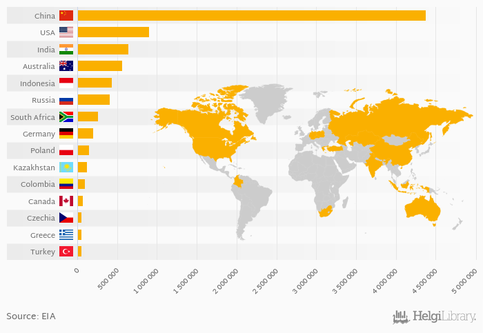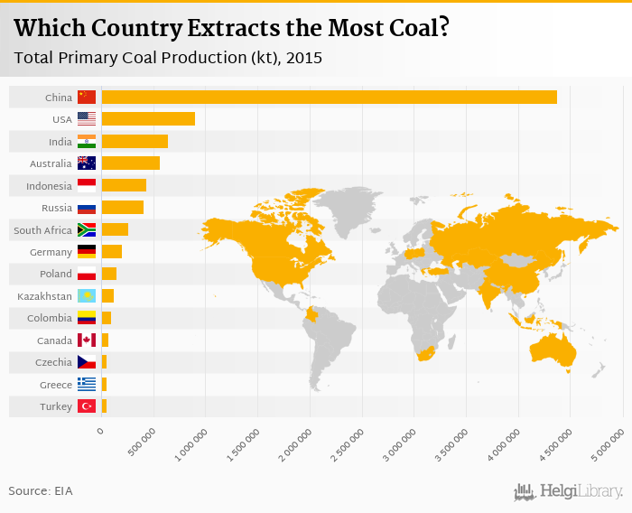 Based on a comparison of 66 countries in 2015, China ranked the highest in primary coal production with 4,376,984 kt followed by USA and India. On the other end of the scale was Albania with 0.100 kt, Nepal with 17.0 kt and Italy with 80.0 kt.