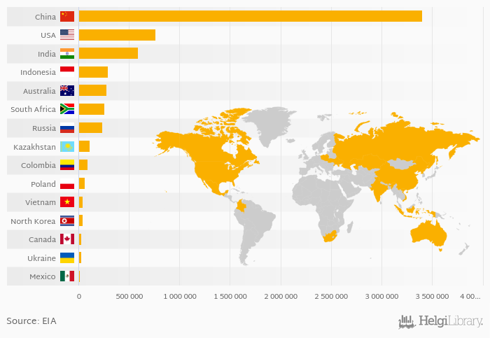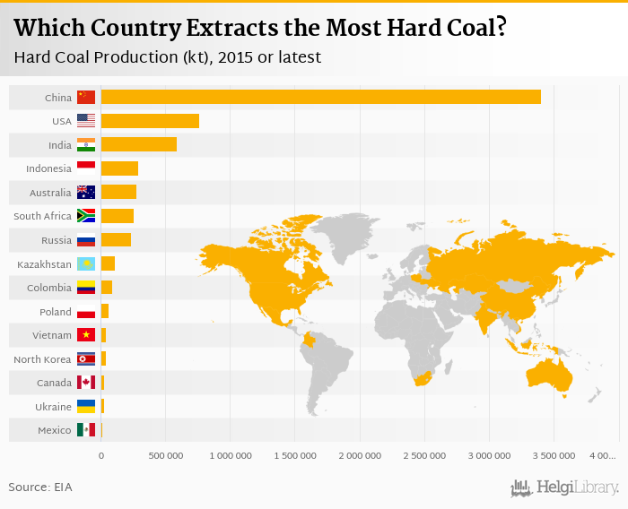 Based on a comparison of 56 countries in 2015, China ranked the highest in hard coal production with 3,404,024 kt followed by USA and India. On the other end of the scale was Bulgaria with 6.61 kt, Romania with 11.0 kt and Nepal with 17.3 kt.