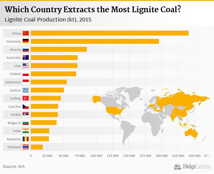 Based on a comparison of 35 countries in 2015, China ranked the highest in lignite coal production with 241,236 kt followed by Germany and Russia. On the other end of the scale was Malaysia with 188 kt, New Zealand with 249 kt and Myanmar with 357 kt.