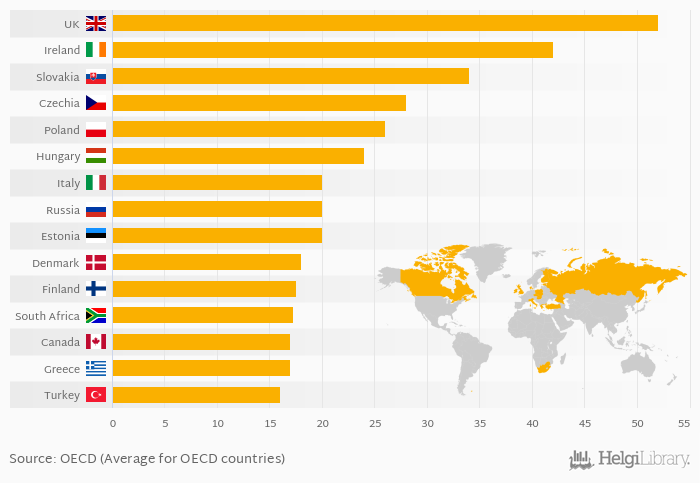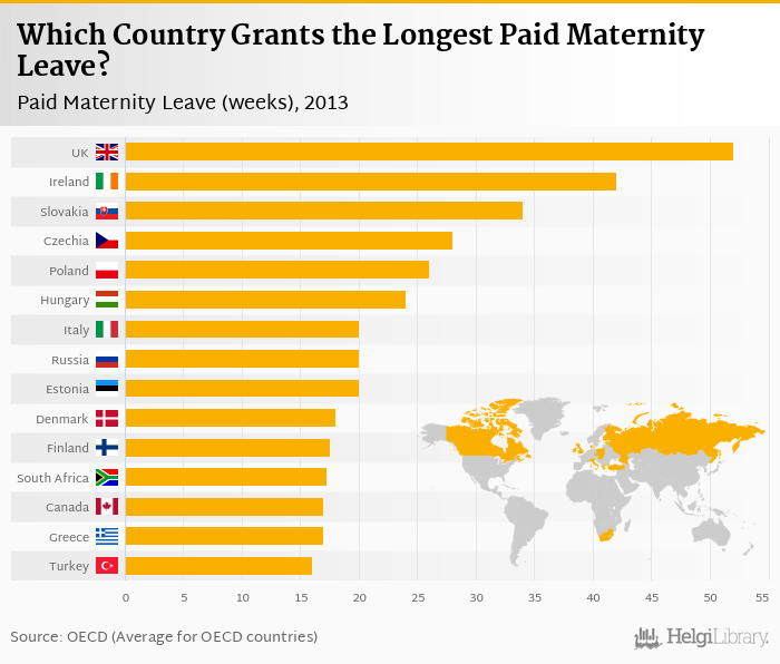 Based on a comparison of 33 countries in 2013, United Kingdom ranked the highest in Paid Maternity Leave with 52.0 weeks followed by Ireland and Slovakia. On the other end of the scale was Australia with 6.00 weeks, Portugal with 6.40 weeks and Sweden with 8.60 weeks.
