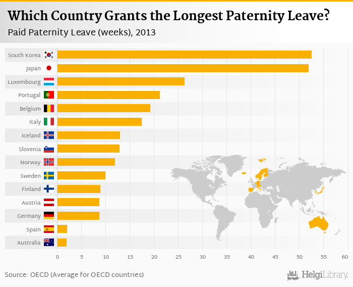 Based on a comparison of 24 countries in 2013, South Korea ranked the highest in Paid Paternity Leave with 52.6 weeks followed by Japan and Luxembourg. On the other end of the scale was Netherlands with 0.300 weeks, Greece with 0.400 weeks and Hungary with 1.00 weeks.
