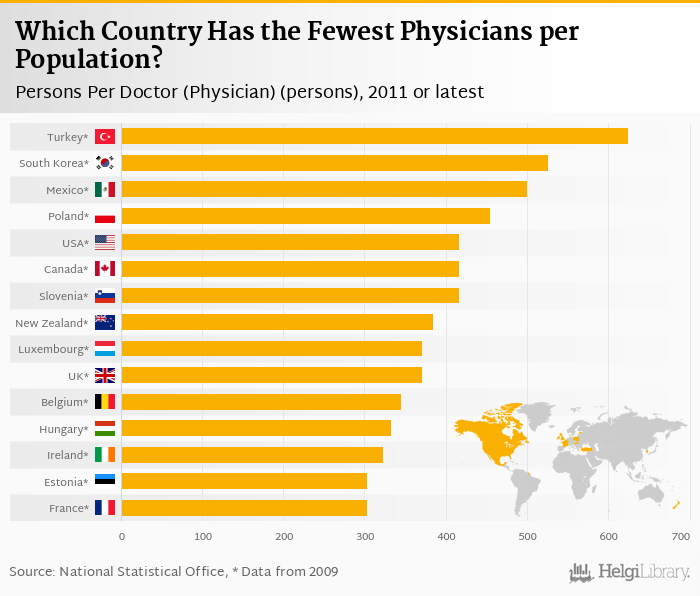 Based on a comparison of 28 countries in 2011, Turkey ranked the highest in persons per doctor, or physician with 625 persons followed by South Korea and Mexico. On the other end of the scale was Greece with 164 persons, Belarus with 181 persons and Austria with 208 persons.