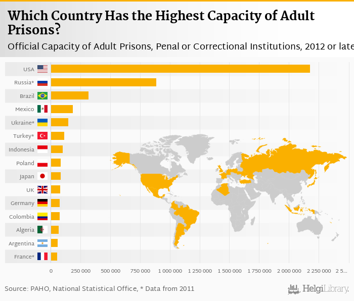 Based on a comparison of 57 countries in 2012, USA ranked the highest in official capacity of adult prisons, penal or correctional institutions with 2,178,000 followed by Russia and Brazil. On the other end of the scale was Iceland with 141, Malta with 613 and Luxembourg with 711.