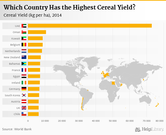 Based on a comparison of 167 countries in 2014, United Arab Emirates ranked the highest in cereal yield with 73,162 kg per ha followed by Oman and Kuwait. On the other end of the scale was Lesotho with 346 kg per ha, Botswana with 349 kg per ha and Niger with 484 kg per ha.