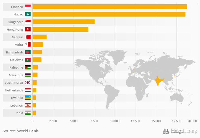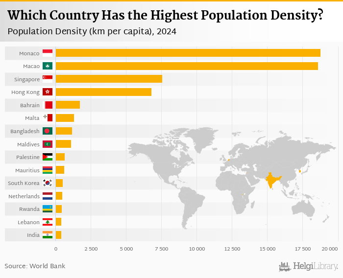 Based on a comparison of 177 countries in 2015, Monaco ranked the highest in population density with 18,779 km per capita followed by Macao and Singapore. On the other end of the scale was Mongolia with 1.80 km per capita, Namibia with 2.75 km per capita and Australia with 2.96 km per capita.