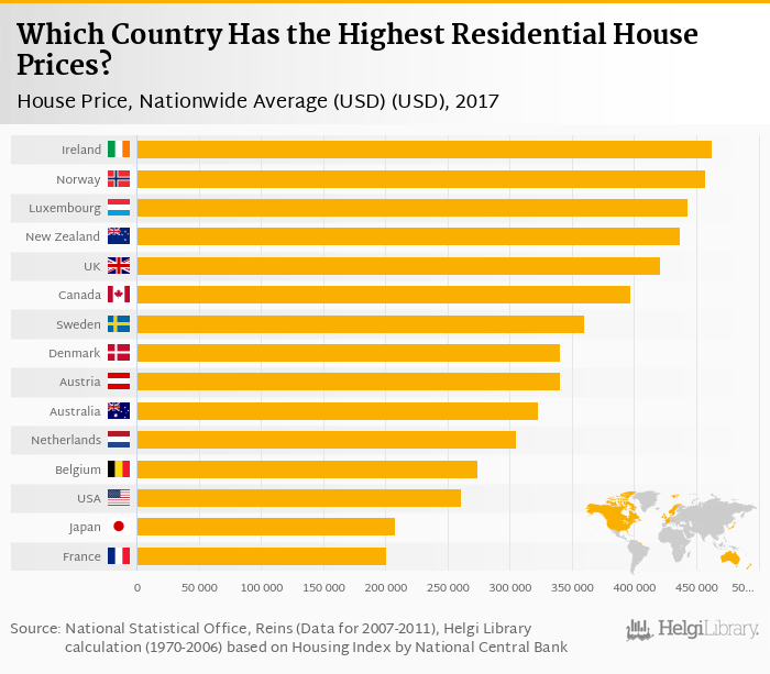 Based on a comparison of 35 countries in 2017, Ireland ranked the highest in average house price in the country with USD 462,993 followed by Norway and Luxembourg. On the other end of the scale was Belarus with USD 747, Mexico with USD 29,998 and Kazakhstan with USD 31,740.