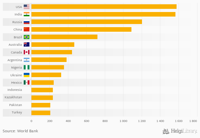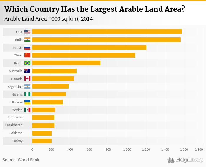 Based on a comparison of 175 countries in 2014, USA ranked the highest in arable land area with 1,579 '000 sq km followed by India and Russia. On the other end of the scale was Cayman Islands with 0.002 '000 sq km, Singapore with 0.006 '000 sq km and Seychelles with 0.010 '000 sq km.