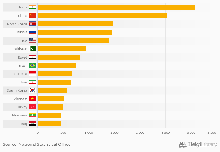 The top ranked country, India, accounted for 11.2 % of armed forces personnel in the world. The top 3 countries hold a 25.8 % share while the ten largest countries some 50.3 % in 2020.